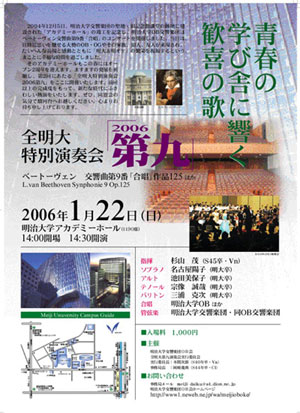 第九合唱演奏会 平成18年12月24日(日) 加茂文化会館 16時開演 東京交響楽団/指揮:堀俊輔 ソリスト: 芳賀 惠(ソプラノ) 押見朋子(アルト) 経種廉彦(テノール) 三浦克次(バリトン) 合唱:第九加茂市民合唱団 |