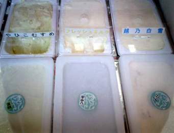 好評発売中 地酒(越乃白雪)・やひこ枝豆(やひこむすめ)・やひこ産巨峰・ストロベリー(越後姫) ・小倉・チョコクッキー・抹茶・山栗・桜・ゴマなど、季節のものも取り入れています。 地元牧場のフレッシュミルクをふんだんに使用 シングル 400円 ダブル 500円