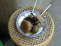 ![]() その次にくるのはこんにゃくおでん。1串100円です。 味が良くしみていておいしいと評判です。 |